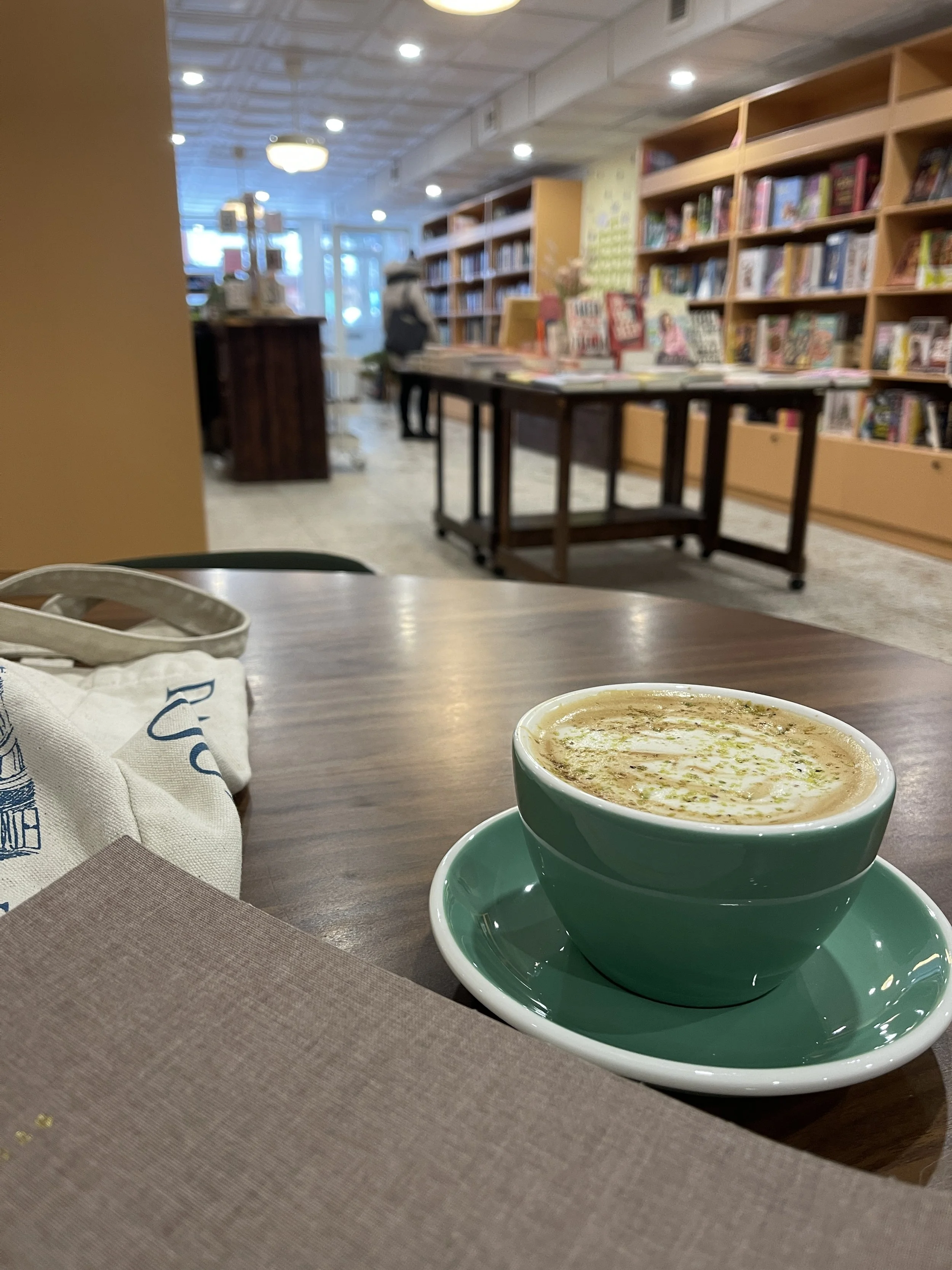 I made my way to the café at the back of the store and ordered a pistachio oat latte (yum!) before settling in to warm up. As I sipped my coffee and jotted down notes for weekend plans and errands, I watched a steady stream of customers come and go. Some grabbed drinks, others picked up books. There were regulars with their kids, ordering hot chocolates and selecting their next reads. It was clear that Pulp Books isn’t just a bookstore — it’s a community staple. And honestly, it made me want to be part of it.